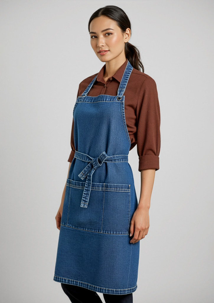 A relaxed, washed denim-look apron that’s practical, stylish, and improves with age, ideal for various industries.