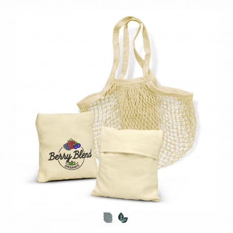 Compact reusable tote bag which is manufactured from 100gsm unbleached cotton mesh. It has a small cotton slip pocket which can be used for storing credit cards, keys etc. and the bag can also be folded to fit in it when not in use.
