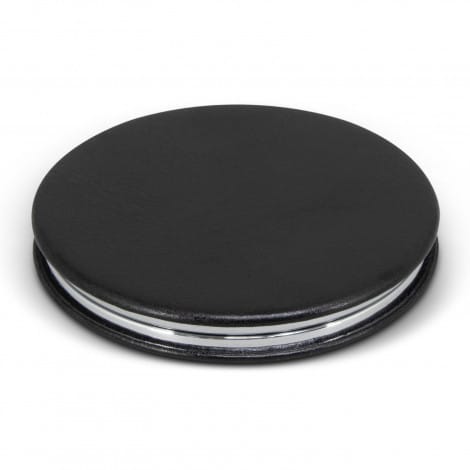 Compact mirror with a hinged cover and black PU exterior. Essence features two mirrors with one being a magnification mirror.