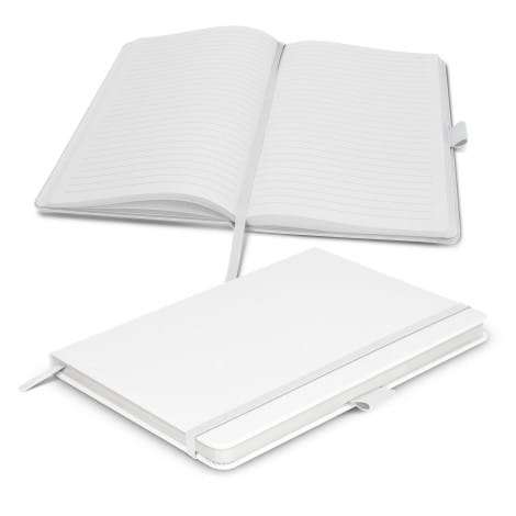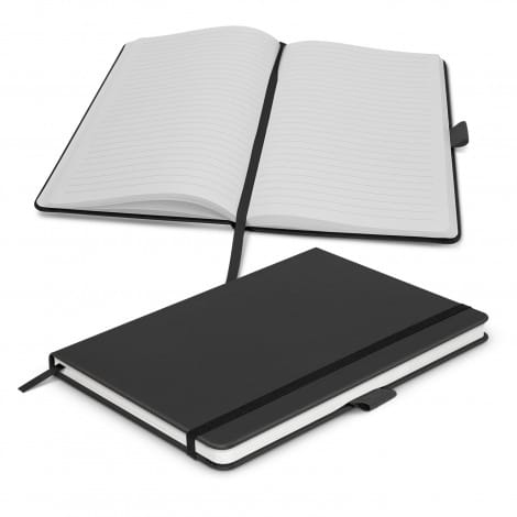 Medium-size (approximately A5) notebook which has a hard cover with a smart PU finish. It has 80 leaves (160 pages) of 70gsm lined paper, a bookmark ribbon, an elastic closure band and an elastic pen loop. An optional paper belly band is available on request and can be branded in full colour.