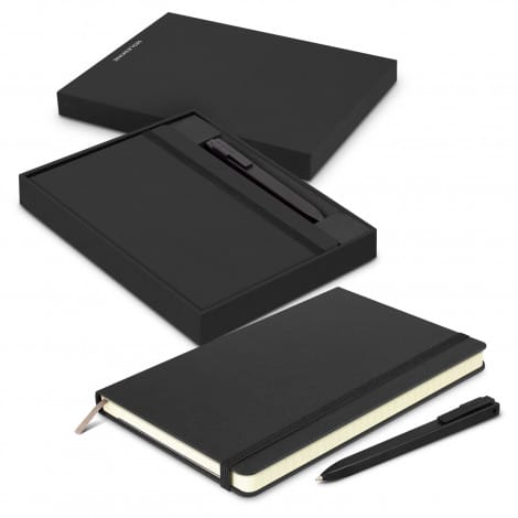Premium Moleskine gift set which is presented in a smart black gift box. It includes a Large Moleskine Classic Hard Cover Notebook and a Moleskine Go Pen. The A5 notebook features 120 leaves (240 pages) of 70gsm Moleskine ivory-coloured lined paper with rounded edges, a bookmark ribbon, and an elastic closure for privacy. The Moleskine pen has a unique side opening clip that attaches firmly and neatly to any Moleskine hard cover notebook or planner. The Go Pen has a Moleskine refill with 3500 metres of black ink and a 1.0mm ballpoint tip for a smooth writing experience. Please note the notebook and pen cannot be supplied without the Moleskine logo. Moleskine reserves the right to decline any custom project or artwork that does not align with their brand on a case-by-case basis.