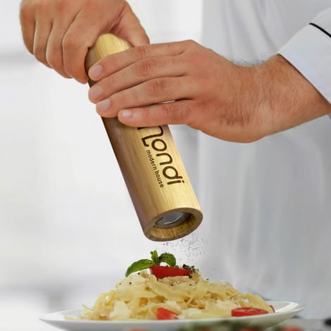 Functional natural bamboo compact pepper mill. The 304 stainless steel and ceramic mill is a durable and efficient grinder, and the adjustable grind allows you to set the coarseness of your pepper to your preference. The mill comes in natural kraft gift box with NATURA branding.