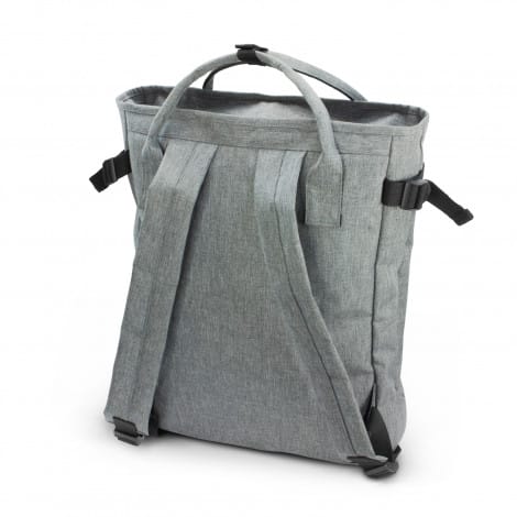 Extra-large tote bag that can also be worn as a backpack. The bag is manufactured from 300D polyester with a two-tone heather style finish. Newport features a zippered top closure, a front slip pocket with a domed closure, and a zipper to access the main compartment from the back of the bag. The bag has a gusset for increased storage, adjustable side straps and padded shoulder straps and carry handles that are riveted to the bag for added strength.
