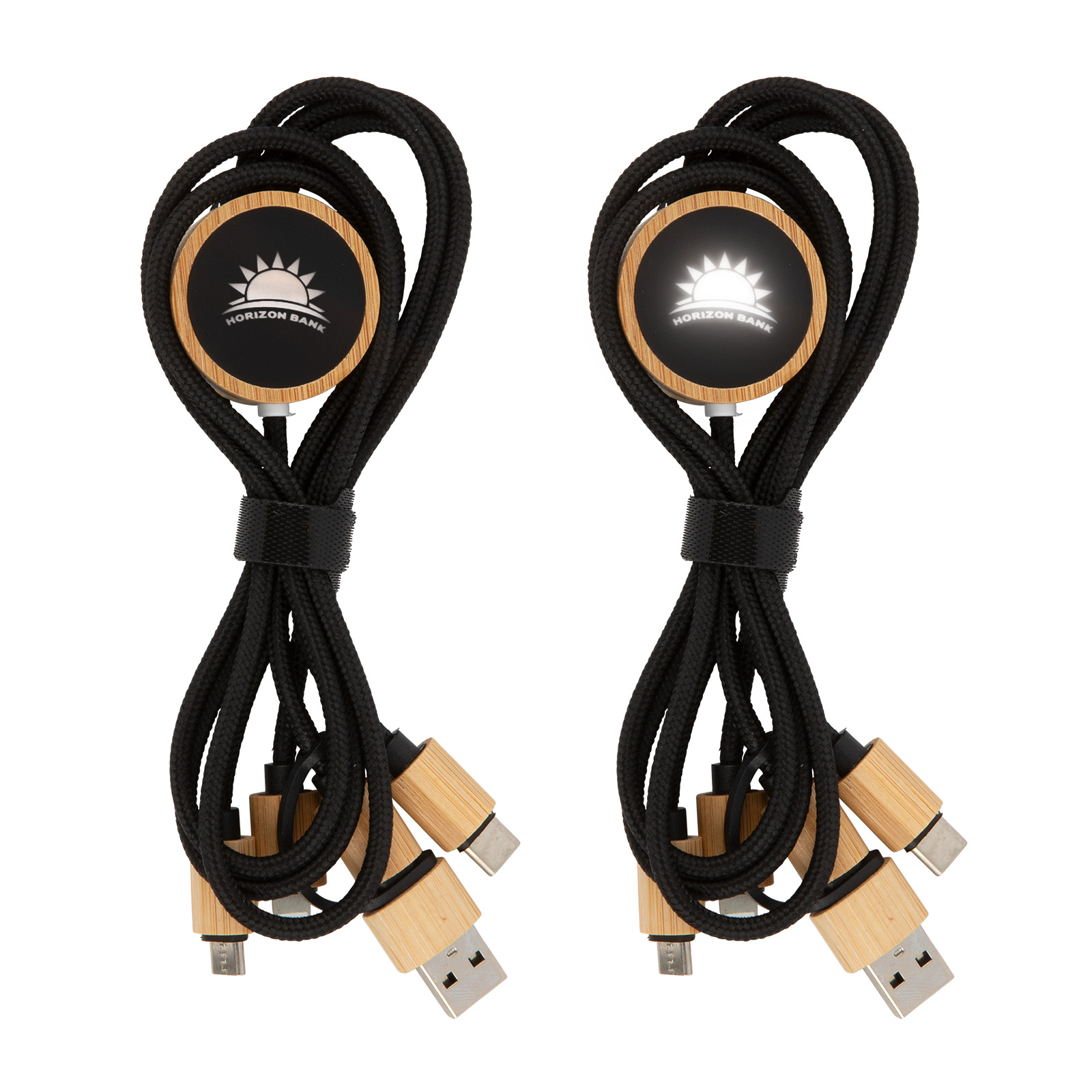 The Raven Cable – a versatile 6-in-1 woven cable designed for sleek and efficient charging. This black cable features bamboo trim on connectors, adding an eco touch to the product. The black circular top section can be lasered and will illuminate when connected, thanks to the hidden white LED light. The connectors include Combo USB A/Type C on one end and Micro USB, 8 pin, and Type C on the other, each as a separate cable, ensuring compatibility with various devices. The cable length is approximately 1.2m, and for added convenience, there’s a Velcro tidy strap on each cable. Please note that the Raven Cable is designed for charging purposes only and does not support data transfer.