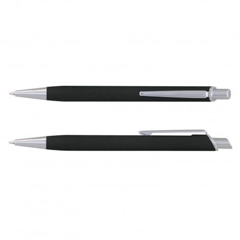 Retractable aluminium ballpoint pen with a unique stone-like textured finish and shiny chrome accents. It has a blue large volume refill with 1800 metres of writing ink and can be presented in an optional pen sleeve.