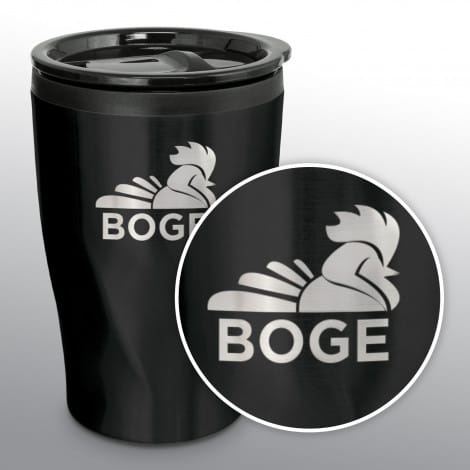 BPA-free 400ml double wall coffee cup which will keep drinks hot for longer. It features a radical twist patterned stainless steel outer wall and a polypropylene inner wall. Tornado has a secure plastic push on lid with a splashproof sliding closure and a soft non-marking base. The black and white cups laser engrave to a shiny steel finish and the silver cups engrave to a natural etch. This product is not dishwasher safe and handwashing is recommended.