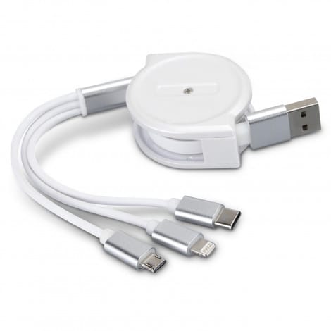 Stylish retractable triple connector cable which is effectively three cables in one and will work with most smart phones. It has a USB plug on one end with a Micro-B connector, a Lightning connector and a USB Type-C connector on the other. This cable is for charging only and is not designed for data connections.