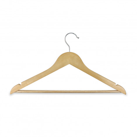 This sturdy wooden clothes hanger is ideal for presenting apparel and showcasing your brand. Designed with easy curves and flat arms to support and maintain garment shape, it features a wooden bar for trousers or skirts and shoulder notches to secure strappy items. The generous branding area ensures your logo stands out.