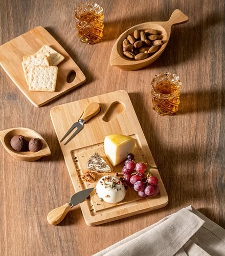 Introducing our Bamboo Cheese Board Set, a perfect blend of natural elegance and functionality. This set includes a bamboo cheese board measuring 310 x 180 x 15 mm, along with two coordinating accessories made from bamboo and stainless steel, ideal for slicing and serving a variety of cheeses.