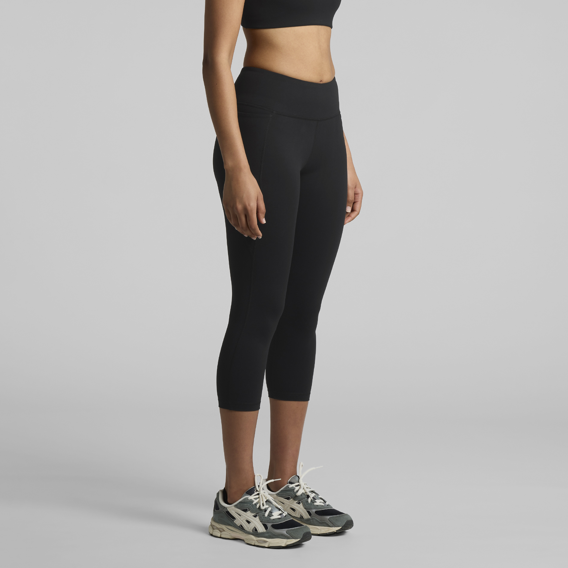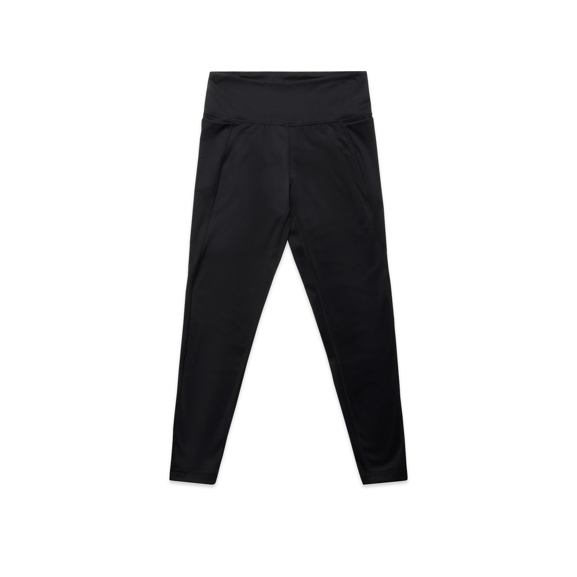 Matte finish, mid calf length, high waist, 2 x side pockets, contour seam detailing, moisture wicking, quick drying, high elastane content for resilience, suitable for low to medium impact activities